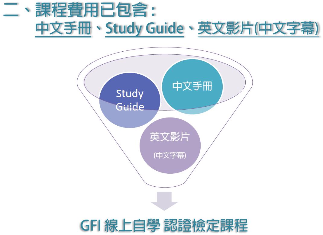 1. 費用已包含 :中文研讀手冊 1本、Study Guide 1本、中/英文版線上自學影片(觀看期限6個月)、線上學科檢定乙次、自選2部體適能線上研習影片。
